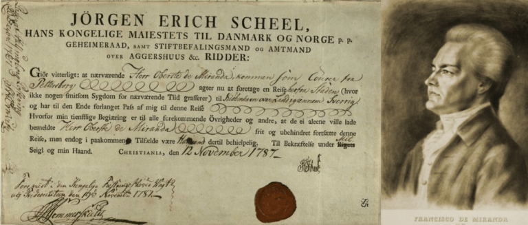 El 10 de agosto de 1785, Sebastián Francisco de Miranda Rodríguez parte de Londres con su amigo el coronel inglés Smith, para asistir a las famosas manobras militares del ejército de Prusia al mando del rey Federico II, ya para esta fecha es considerado peligroso por las autoridades de la corona española a la cabeza del conde de Floridablanca, que urden un plan para apresarlo en Francia. Sin saber nada de la emboscada española en la ciudad de Calais en Francia, decide viajar a Prusia a través de Holanda –República de los Siete Países Bajos Unidos, para la época- llegando al puerto neerlandés de Hellevoetsluis, quizá por un azar de la providencia o simplemente porque esa ruta resultaba un tanto más corta y menos agotadora para el viaje. Si quieres recibir nuestros artículos más recientes suscríbete aquí Llegada a Prusia Pocos días después de llegar a Europa continental y de haber desembarcado en el puerto de Hellevoetsluis, tanto Miranda como su amigo el coronel Smith recorren aproximadamente unos 650 kilómetros hasta Prusia, donde son recibidos por el Príncipe Ferdinand de Brunswick y el rey Federico II. En la ciudad de Potsdam a las afueras de Berlín, Lafayette les ofrece recibirlos en París luego del periplo que tienen programado; sin embargo Miranda desconfía de Lafayette pues considera que es un agente al servicio de la corona de España. Periplo hasta Dinamarca En su camino hacia la ciudad de Viena, Miranda y el coronel Smith contemplan varios campos de batalla que fueron el escenario de glorias militares pasadas en el centro de Europa. Al arribar a la ciudad de Viena -capital del Imperio para aquel momento-, deciden visitar la biblioteca imperial, donde se percatan de un uniforme que perteneció al conquistador español Hernán Cortez, obsequio para el emperador Carlos V. Luego al acudir a un teatro en Viena, quedan admirados por la discreción y sencillez del emperador José II. Posteriormente Miranda se dirige en solitario hacia Hungría donde reside por 3 días en el palacio Eszterháza del Príncipe Miklós Esterházy, donde el compositor Joseph Haydn le sirve de anfitrión. Entre noviembre de 1785 y marzo de 1786, recorre varias partes de Italia, haciendo anotaciones de los lugares que visita, tomando lecciones de italiano al mismo tiempo que resaltaba en sus anotaciones el patrimonio artístico, así como la suciedad de las ciudades y la poca honestidad de sus ciudadanos. Su próximo destino será Grecia, a la que llega luego de haber cruzado el Mar Adriático hasta llegar a la ciudad de Dubrovnik para continuar navegando a lo largo de la costa de Dalmacia hasta arribar a una Grecia bajo dominación turca que le impresiona por la amplia afición de sus habitantes hacia la música, observa por primera vez lugares y monumentos que sólo ha imaginado en sus lecturas de la antigüedad, traduce del griego y del latín numerosas inscripciones de los monumentos que contempla. Miranda pasa de Grecia a Turquía donde visita la ciudad de Esmirna y luego pasa a Estambúl, ciudad que lo deja impresionado al escribir: «No se puede [..] dar una cabal idea del grupo bello y grandiosísimo que desde el mar presenta la ciudad de Constantinopla» En Turquía las autoridades asumen que Miranda es un noble al leer incorrectamente su pasaporte, de allí en adelante será llamado «Sr Conde», lo que le servirá para despistar a los agentes de la corona española que buscan dar con su paradero. Entre octubre de 1786 y septiembre de 1787 se encuentra Miranda en territorio ruso y en la Mancomunidad de Polonia-Lituania invitado por el rey Estanislao II Augusto Poniatowski, último rey de Polonia como Estado-nación independiente; una de las ciudades de importancia a la que arriba Miranda durante este período es Jersón en la actual Ucrania, luego encontramos a Miranda siendo presentado ante el influyente y muy poderoso príncipe ruso Grigori Potemkin, amante de la zarina Catalina II de la cual recibe Miranda protección diplomática, el derecho a portar el uniforme de coronel ruso y 10.000 rublos. Miranda se embarca en el puerto ruso de Kronstadt con destino a Suecia el 7 de septiembre de 1787, ya en Suecia presenta sus credenciales ante Andrei Razumovski diplomático ruso en Suecia, quien le recomienda asumir un bajo perfil y mucha cautela ante la presencia de posibles espías españoles. En Suecia Miranda visita minas de cobre, industrias, y la biblioteca real donde conoce al rey Gustavo III, quien sospecha que Miranda pueda ser un espía ruso. La mayor parte del mes de noviembre de 1787 se encontraba Miranda en la ciudad de Cristianía -actual ciudad de Oslo capital de Noruega-, visitando los típicos lugares de su interés: bibliotecas, zonas militares, minas, puertos y bosques. Miranda estaba impresionado con este país escandinavo llegando a escribir: «Es algo digno de admiración, ver el grado de civilización, de instrucción y elegancia como estas personas viven aquí… es el resultado del comercio y la comunicación que poseen con Inglaterra y Holanda» El 12 de noviembre de 1787, el gobernador de la ciudad de Cristianía –actual ciudad noruega de Oslo-, le otorga a Miranda un pasaporte para pasar a Dinamarca por tierra a través de Suecia, en aquella época tanto Noruega como Dinamarca formaban parte del mismo Estado con el nombre de Reino de Dinamarca y Noruega (Kongeriget Danmark og Norge). El pasaporte indicaba lo siguiente en danés: Hans Kongelige Maiestets til Danmark og norge Geheimeraad samt stiftbefalingsmand og amtmand over aggershuus und Ridder Giör vitterligt: at naervaer ende Herr oberste de Miranda kommen agter nu at foretage en reife (ikke nogen smitsom Sygdom for naervaerende Tiid grafferer) og har til den ende forlanget Pafs af mig til denne Reife Hvorfor min tienslige Begiaering er til alle forekommende óvrigheder og andre, at de ei aleene ville lade bemeldte Herr oberste de Miranda frit og ubehindret forrsaette dene reife, men endog i pa